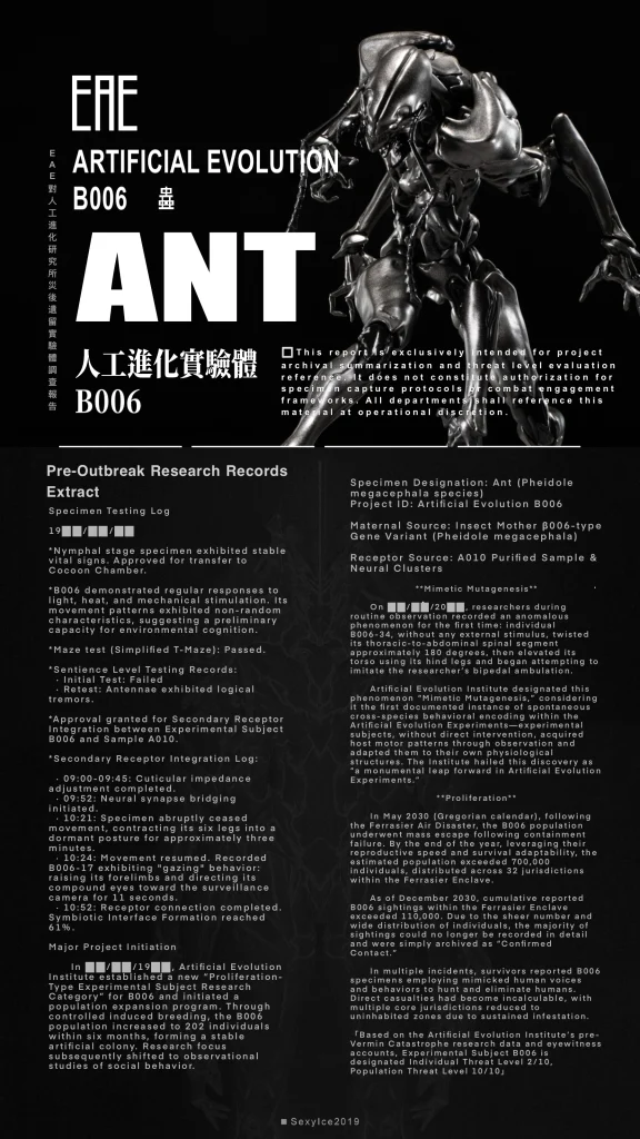 Expand your figure collection with the VERMIN Series Artificial Evolution B006 Ant 1/12 scale action figure by Sexy Ice 2019! This figure features multiple points of articulation for creating a variety of poses and stands a little under 7 inches in height. Artificial Evolution B006 Ant also comes with additional parts and accessories to customize the figure how you want! Don’t miss out on adding it to your collection!